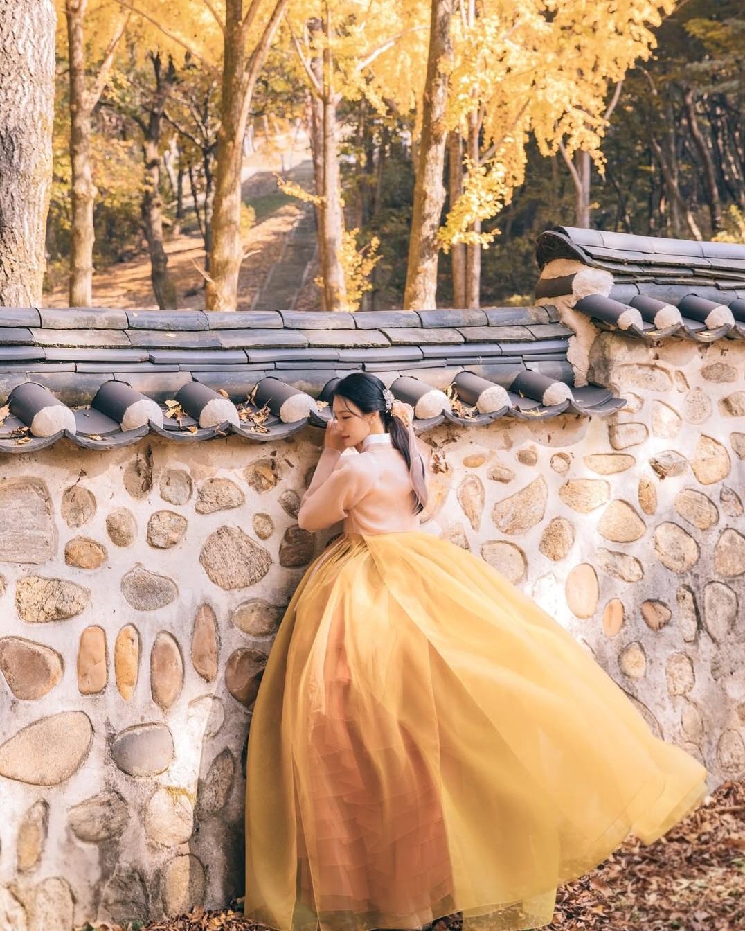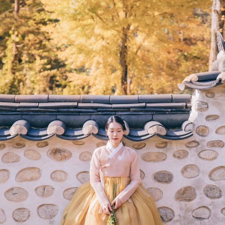 △ 모델 착장 - 12단 단색 무지기(말린장미), 단색 갈래 덧치마(올리브 그린), 단색 덧치마(은행노랑), 2겹 노방 저고리(베이지) △