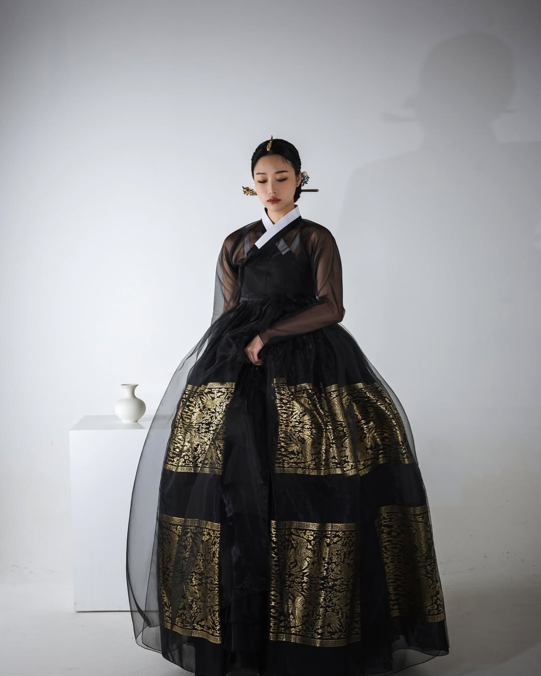 △ 모델 착장 - 12단 단색 무지기(블랙), 금박 갈래 덧치마(블랙), 단색 덧치마(스페셜 블랙), 홑겹 노방 저고리(블랙) △